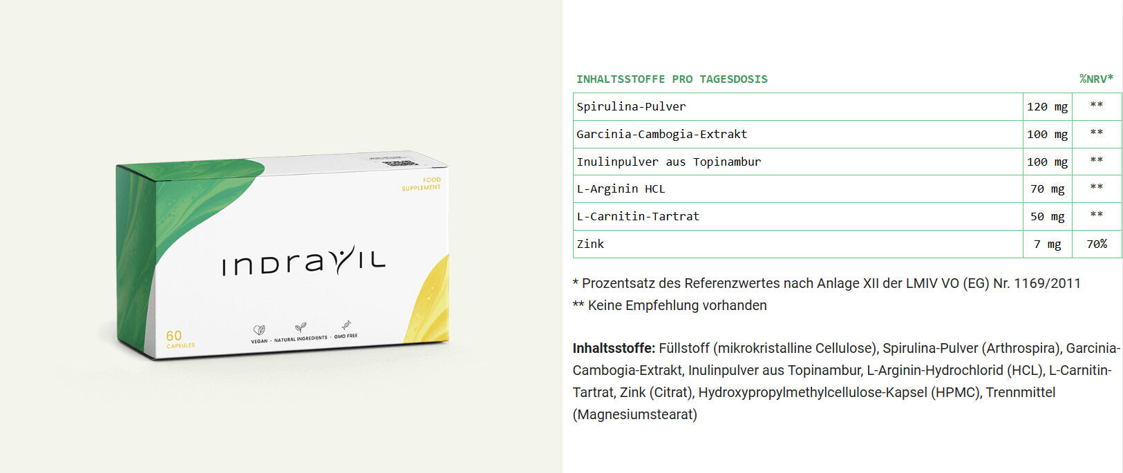 Die Indravil-Kapseln, hergestellt in Deutschland nach höchsten Qualitätsstandards, bieten eine einzigartige und innovative Kombination natürlicher Inhaltsstoffe. Diese harmonieren perfekt, um sowohl die Gewichtsabnahme als auch die Appetitkontrolle zu unterstützen. Abnehmen war noch nie so einfach – erleben Sie schnelle Ergebnisse ohne Verzicht oder zeitaufwendiges Training!Viele von uns kennen das Gefühl, wenn das Gewicht aus dem Gleichgewicht gerät. Der entscheidende Schritt ist, aktiv etwas dagegen zu tun. Wenn Sie nach einem Nahrungsergänzungsmittel suchen, das Sie auf Ihrem Weg unterstützen kann, könnten Indravil-Kapseln die richtige Wahl sein.Die Kapseln bestehen ausschließlich aus natürlichen Zutaten, sind frei von allergenen Stoffen und zeigen keinerlei Nebenwirkungen, wenn sie sachgemäß eingenommen werden. Sie ermöglichen es Ihnen, langfristig an Ihrem Ziel zu arbeiten, ohne dabei Ihre Gesundheit zu belasten.Alle Inhaltsstoffe gelten als sehr gut verträglich und sollten daher keine Probleme verursachen. Es ist jedoch wichtig, die empfohlene Dosierung des Herstellers genau einzuhalten. Eine höhere Einnahme verbessert die Wirkung nicht, kann jedoch das Risiko von Nebenwirkungen erhöhen.Bitte prüfen Sie vor der Einnahme, ob Sie gegen einen der Inhaltsstoffe allergisch sind. Falls ja, sollten Sie auf die Einnahme verzichten. Bei Unsicherheiten empfiehlt es sich, einen Arzt zu konsultieren. Er kann Ihnen weitere Informationen geben und Sie bei der sicheren Anwendung der Kapseln unterstützen.